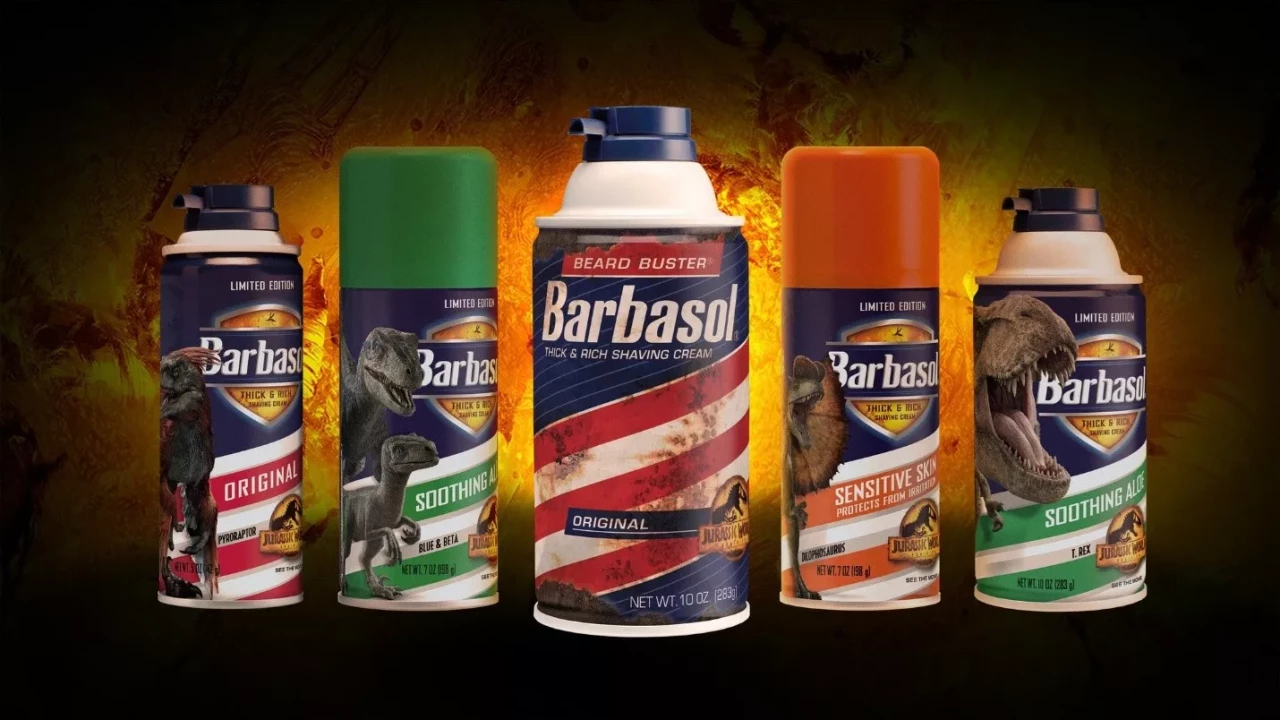 Barbasol continues to partner with Universal Pictures on the Jurassic World: Dominion movie that featured (spoiler alert) ... the long-lost Barbasol cryo can. Limited-edition Barbasol shaving cream cans featuring Jurassic World: Dominion dino characters were released into the wild to celebrate this film.